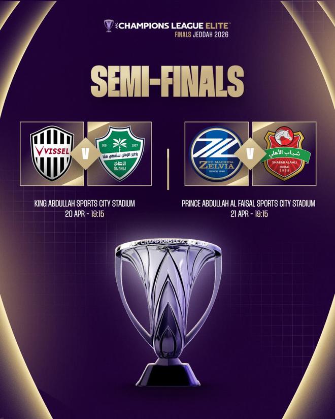 如此一来,本赛季亚冠4强全部出炉。两支日本球队神户胜利船和町田泽维亚将在半决赛分别面对吉达国民和迪拜青年国民。