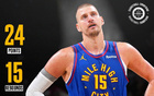 单看约基奇的数据其实不差,全场比赛40分钟,20中8,三分7中1,罚球7中7,拿到24分15篮板8助攻1盖帽3失误,命中率50%,三分命中率14.3%,真实命中率52%,正负值+1。