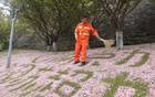 就在几天前,这位被网友亲切称为“浪漫大叔”“最有才扫地僧”的园林养护工人,用扫帚和飘落的樱花瓣,在玄武门城墙下工工整整地铺排出了“南京加油,苏超加油”的字样,引来市民游客驻足打卡。去年12月,他还曾以落叶为墨,写下“南京”“2025”“2026”,温暖了一座城的岁末。